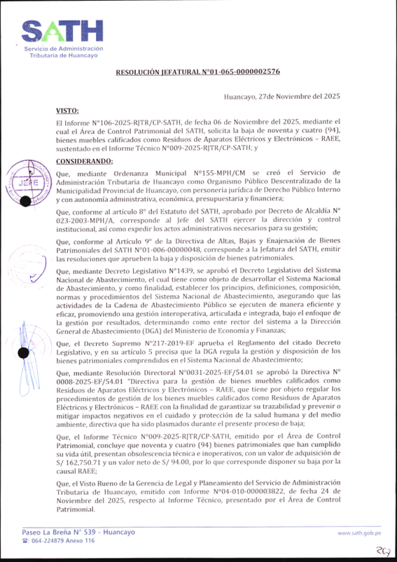 El Informe Nº 106-2025-RJTR/CP-SATH, de fecha 06 de Noviembre del 2025, mediante el cual el Área de Control Patrimonial del SATH, solicita la baja de noventa y cuatro (94), bienes muebles calificados como Residuos de Aparatos Eléctricos y Electrónicos - RAEE, sustentado en el Informe Técnico Nº 009-2025-RJTR/CP-SATH; y