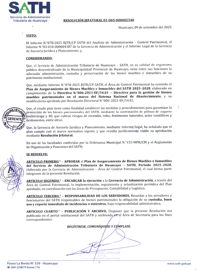 El Informe Nº 078-2025-RITR/CP-SATH del Analista de Administración - Control Patrimonial, el Informe Nº 03-010-000004387 de la Gerencia de Administración y el Informe Legal de la Gerencia de Asesoría furídica y Planeamiento; y,